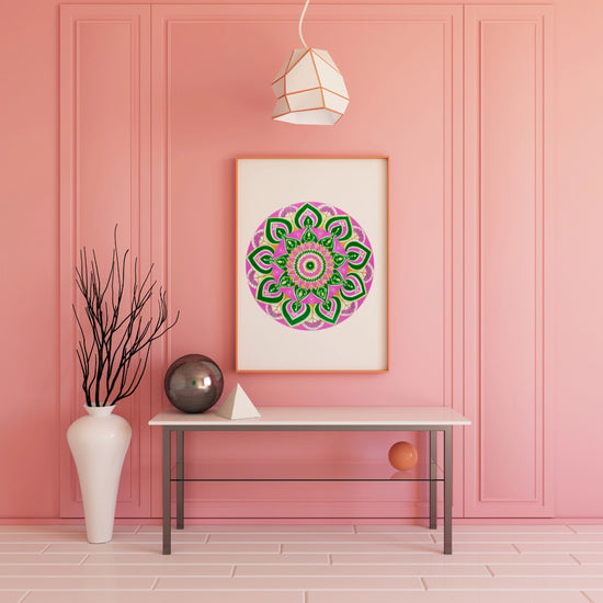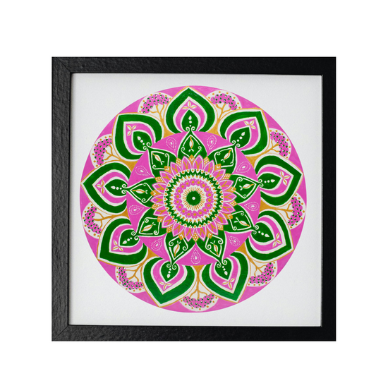 This Mandala is a mix of green- that signifies growth and pink- that signifies compassion. The outer layer of the circles has the golden colour that brings the art to life- just like the golden tree that adorns the outer circle. The two colors together remind us - life is all about hope, and growing from where we are but with kindness and compassion towards others.