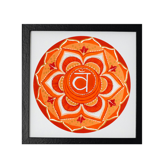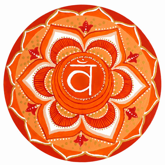 The symbol of this mandala is a lotus flower with six orange petals. The seed sound at the center of the lotus is "vam". The color of this chakra is orange- the color of fire and passion. The chakra is the center of our creativity, sexuality and pleasure.