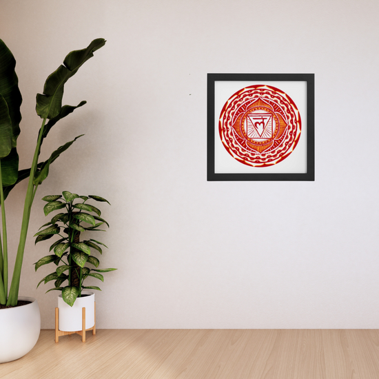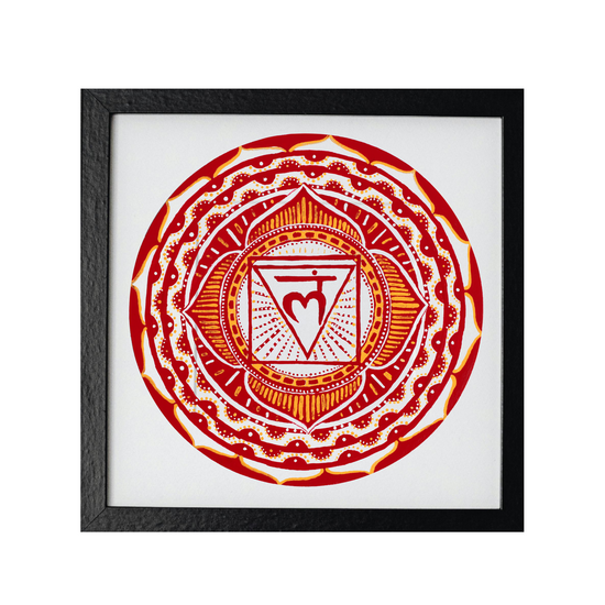The colour of this mandala is that of molten lava- symbolizing earth, vitality, and raw energy. The chakra is represented by a four-petaled lotus with a ‘Lam’ sound that ignites the fire within. It connects all the other six chakras. A strong and balanced root chakra will provide a solid foundation for one’s spiritual well-being.