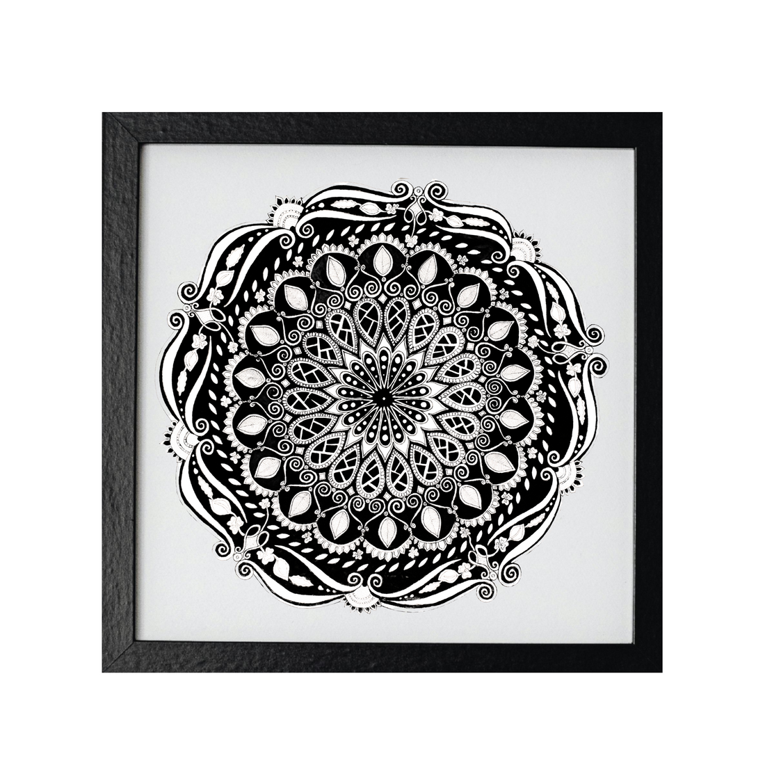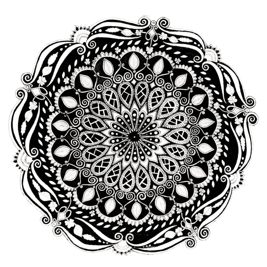 The outer pentagonal frame features ten inner circles, each with three unique leafy patterns. The pentagon symbolizes balance and harmony, while the leaves reflect nature's beauty and resilience. This mandala unites geometry and organic design, inspiring equilibrium and connection.