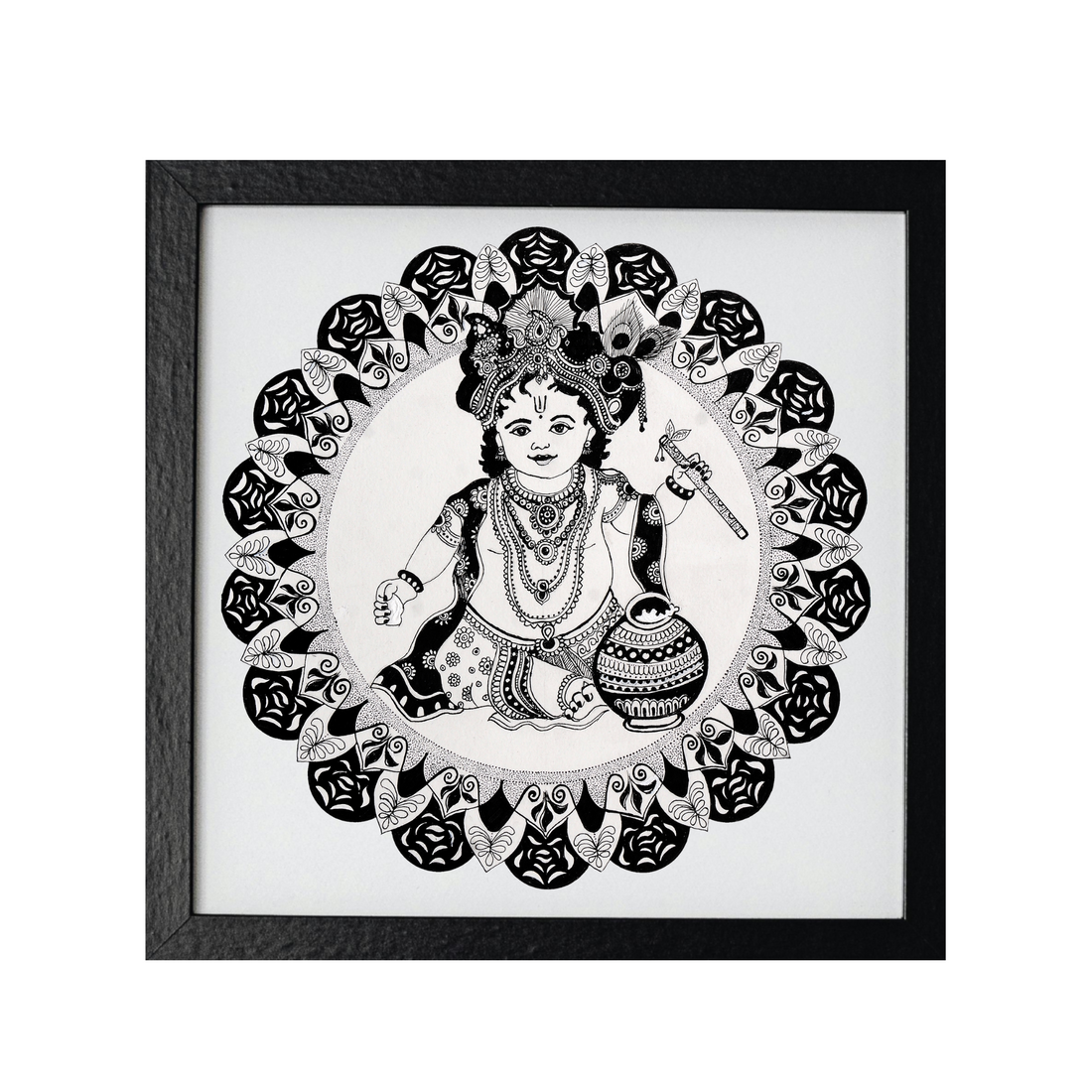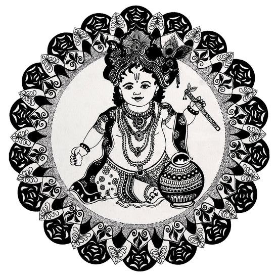 This Mandala captures Krishna’s mischievous yet innocent smile, adorned with beautiful ornaments, a flute, a peacock feather crown, and a butter pot with a ball of butter in his hand. The design’s thought is simple- minimalist lines, monochromatic tones, symmetrical shapes, and geometric patterns in the outer circle.