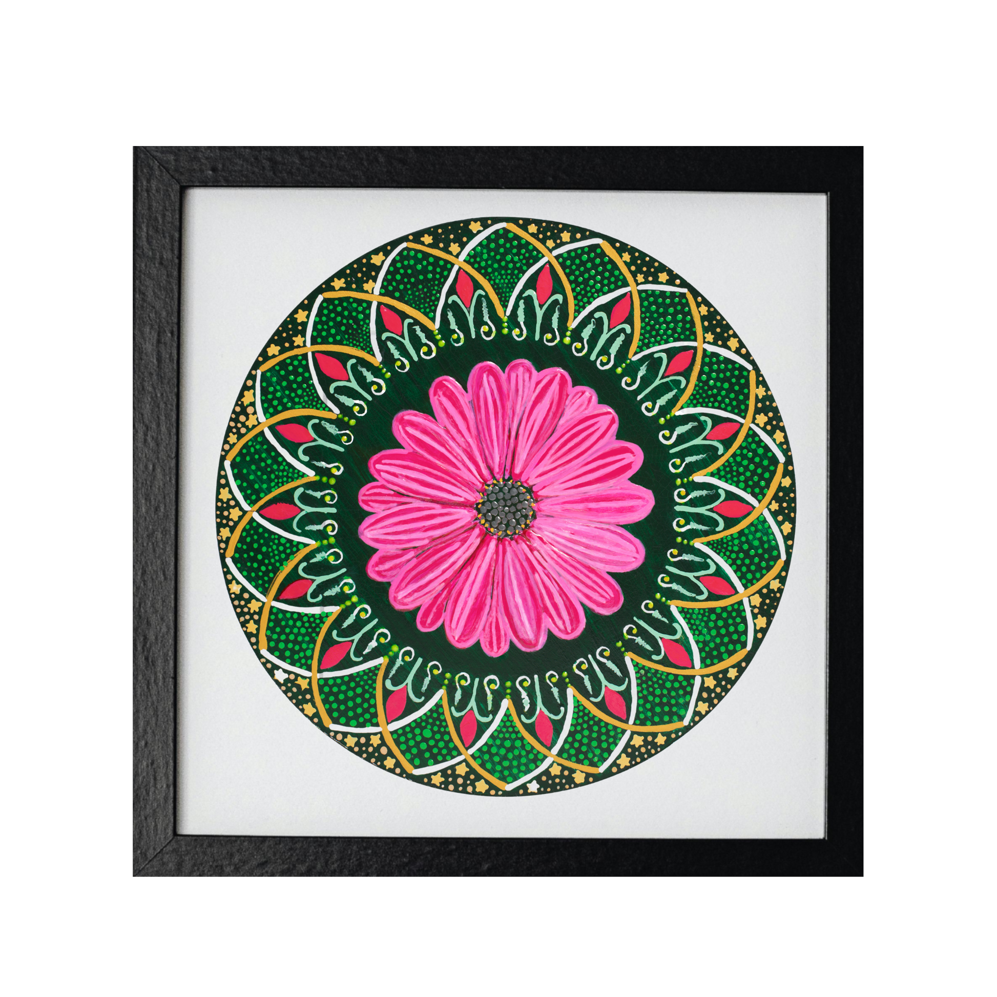 This mandala is a humble attempt at recreating the beauty of a flower in the centre and creating leafy patterns, rosebuds with vines and pollens in the outer circles- presenting the blooming mandala.